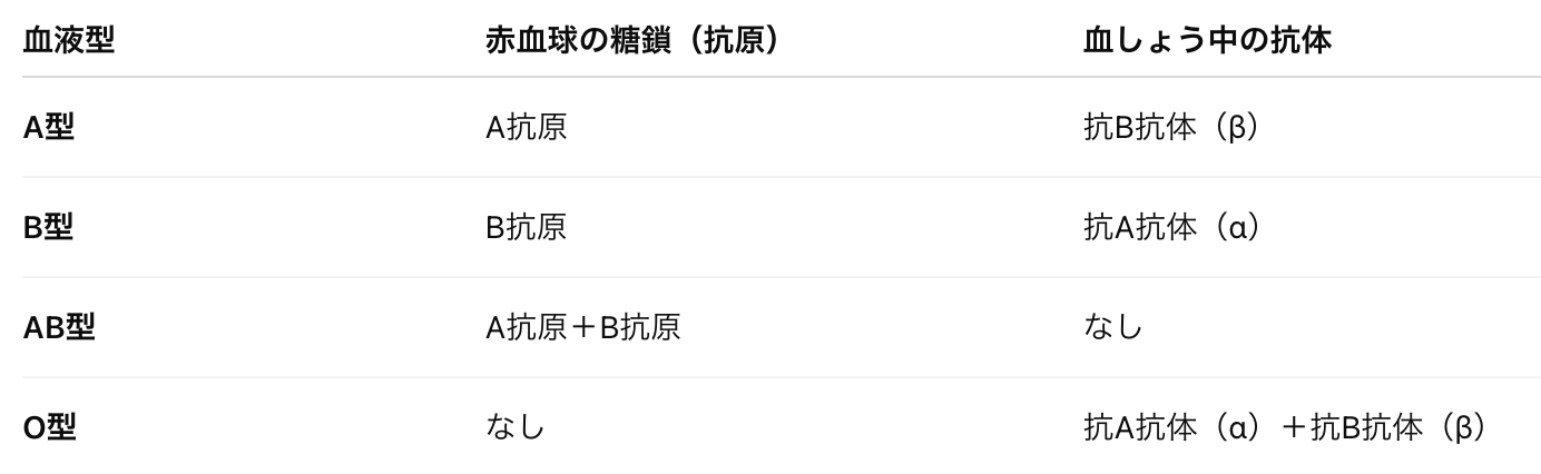 O型 → どちらの抗原も「自分にない」 → 抗A抗体、抗B抗体を両方持つ