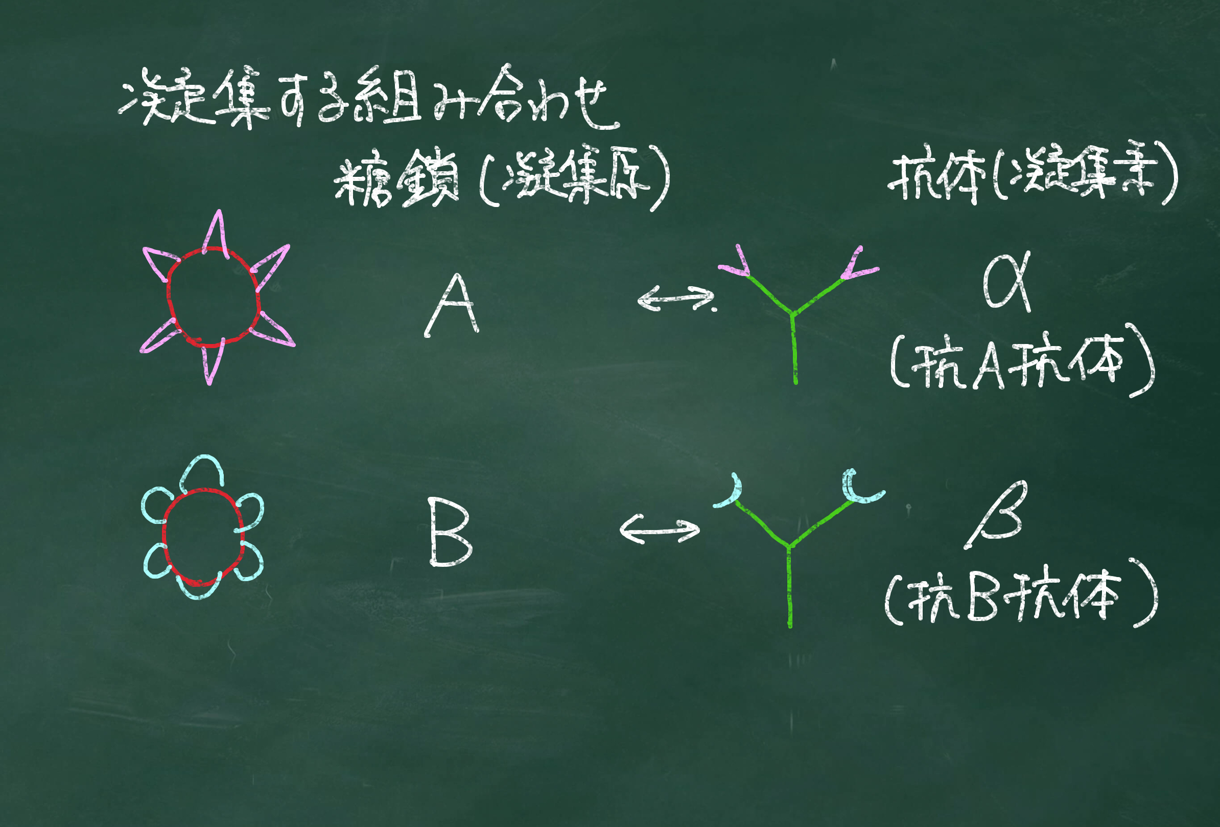 一方、血しょう(血液の液体部分)には、この糖鎖を認識して、特定の血液型の赤血球だけを集めて固める抗体(=凝集素) が存在しています。