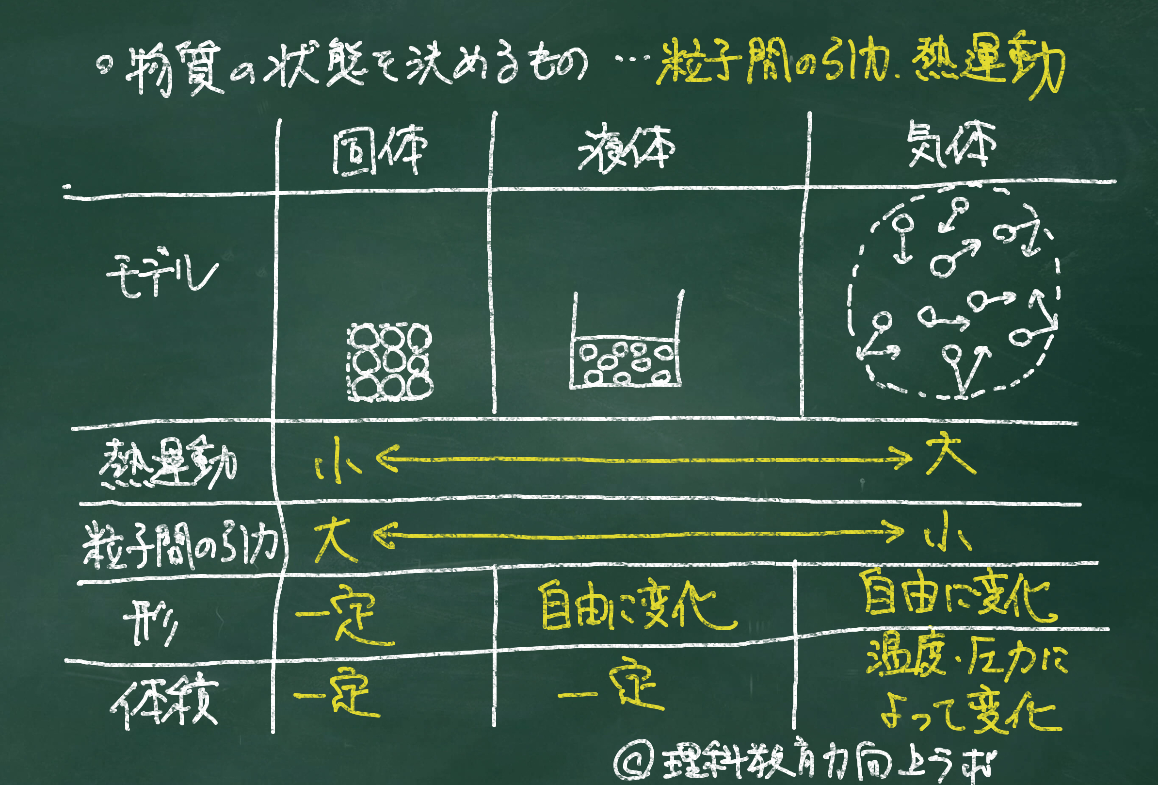 状態が固体 → 液体 → 気体と変化するほど、粒子の熱運動は 激しくなる、粒子間の引力は 弱くなるという特徴があります。
