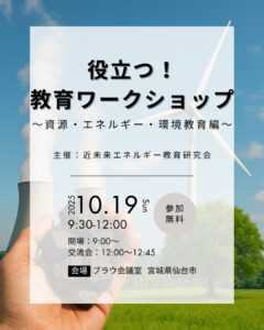 2025年10月19日(日)9:30より宮城県仙台市にて、近未来エネルギー教育研究会が主催する「役立つ!教育ワークショップ〜資源・エネルギー・環境教育編〜」が開催されます。 このワークショップでは文部科学省の方による基調 […]