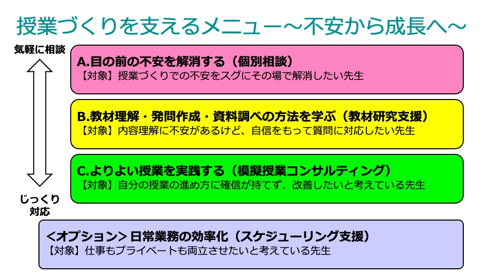 そんな日々の“モヤモヤ”に対して、授業の“化学反応”を引き起こす触媒=カタリストとして、あなたの授業づくりを共に考え、支えます。